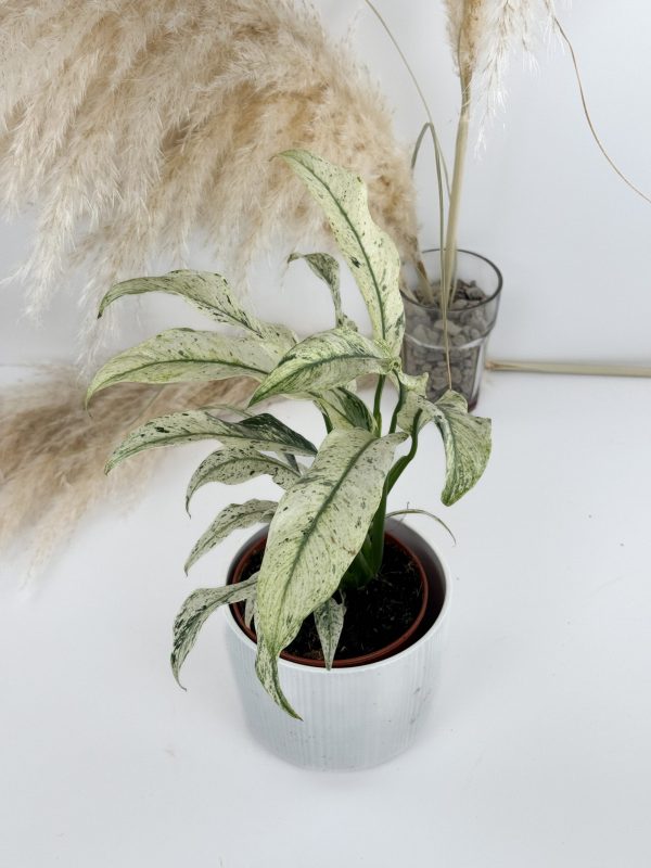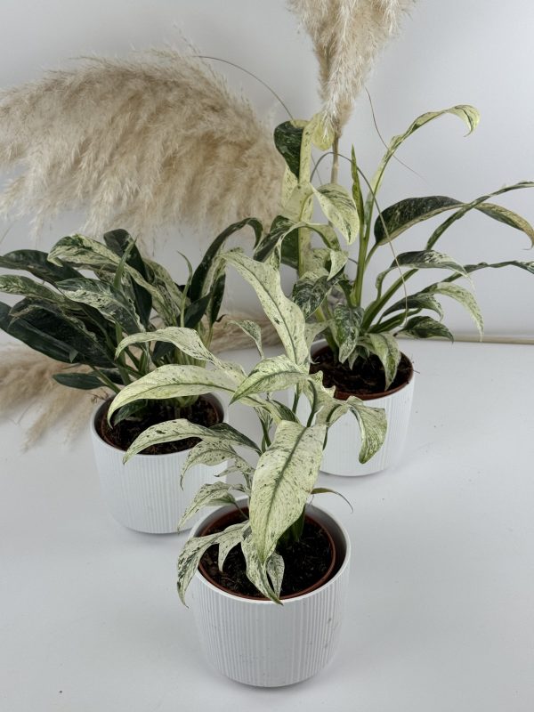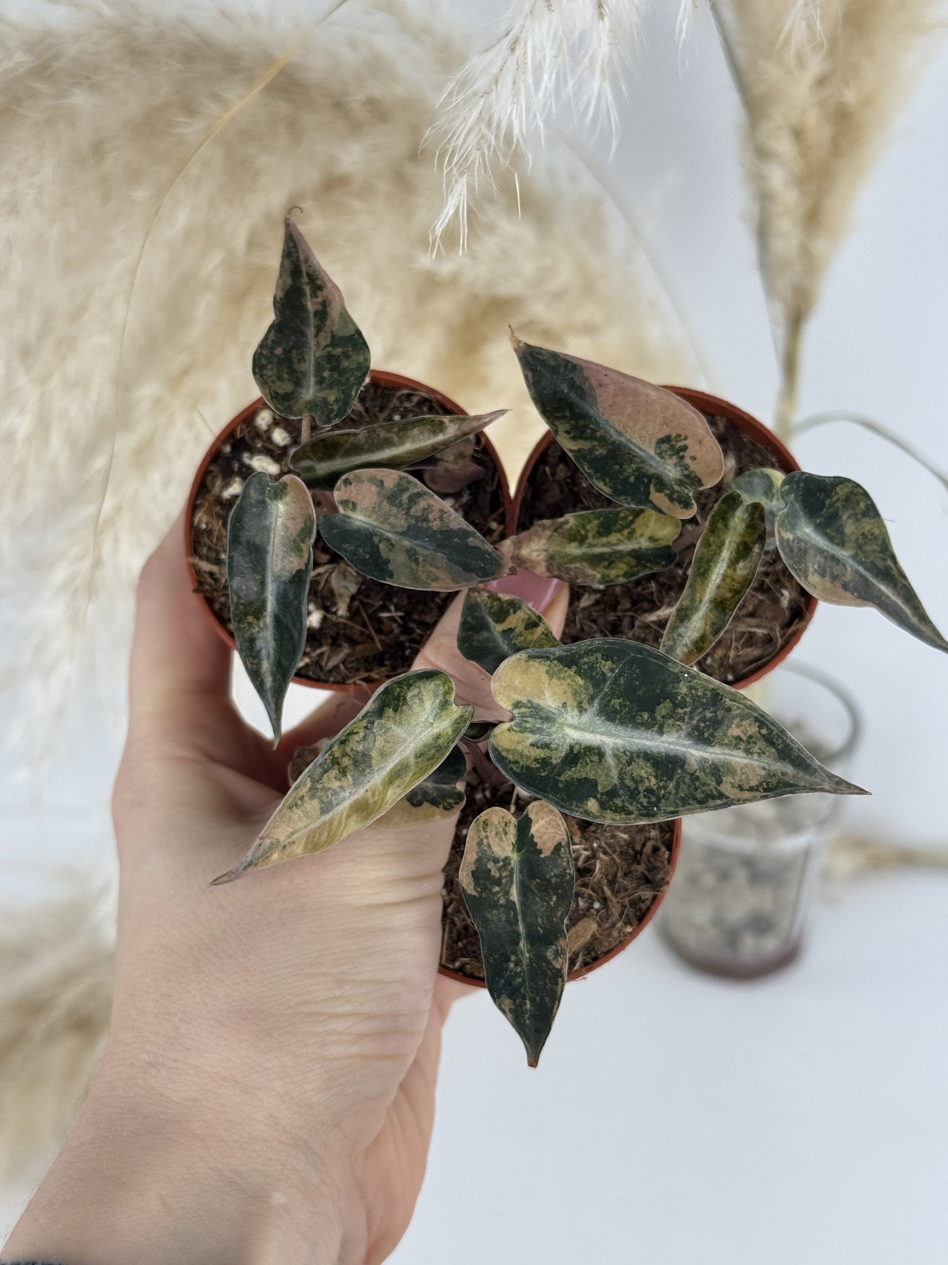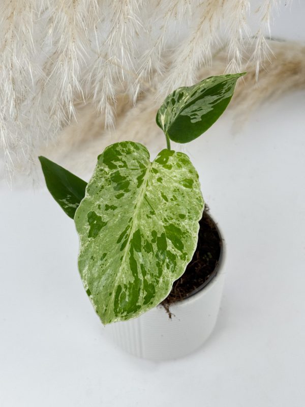 Die Alocasia Bambino Aurea Variegata ist eine schöne Zimmerpflanze mit Sammlerwert, die durch ihre schmalen, pfeilförmigen Blätter und die auffällige gelb-grüne (aurea) Variegation auffällt. Natürlich hat jede Pflanze eine individuelle Blattzeichnung – von feinen Sprenkeln bis hin zu großflächigen Farbklecksen. Sie wächst sehr kompakt und bleibt eher klein, daher eignet sie sich ideal für Vitrinen oder mit Pflanzen vollgestellte Fensterbänke. 😉