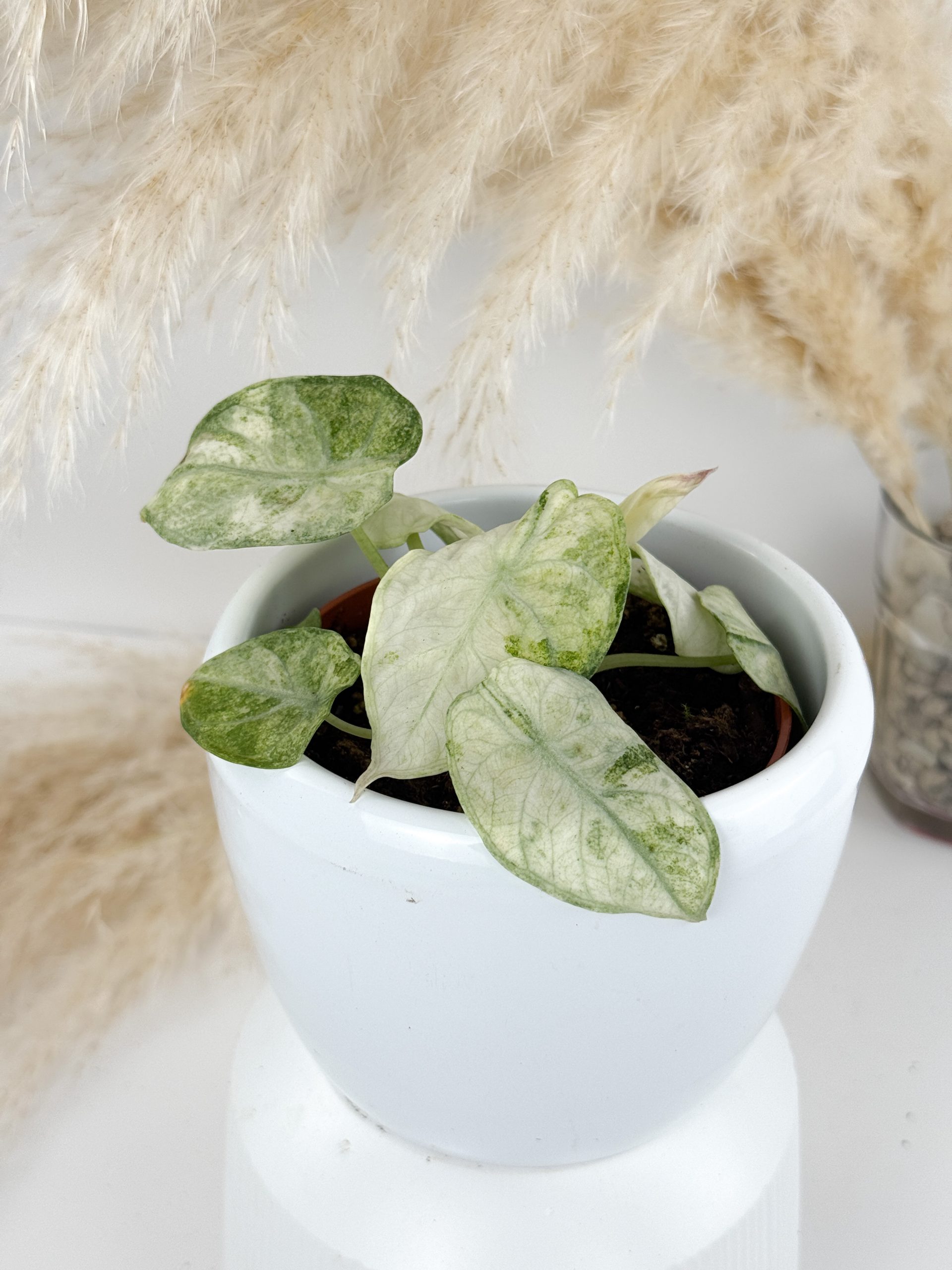 Die Alocasia Ninja Tricolor Variegata ist eine eher außergewöhnliche Rarität unter den Alocasien und begeistert mit ihrem mehrfarbigen, mintig, weiß, pinken Mustern, der von cremeweißen, hellgrünen und graugrünen Variegationen durchzogen wird. Sie hat eine kompakte Wuchsform und kontrastreiche Mehrfarbigkeit. Außerdem ist sie auch als schnellwachsende “Rhizom-maschine” bekannt.