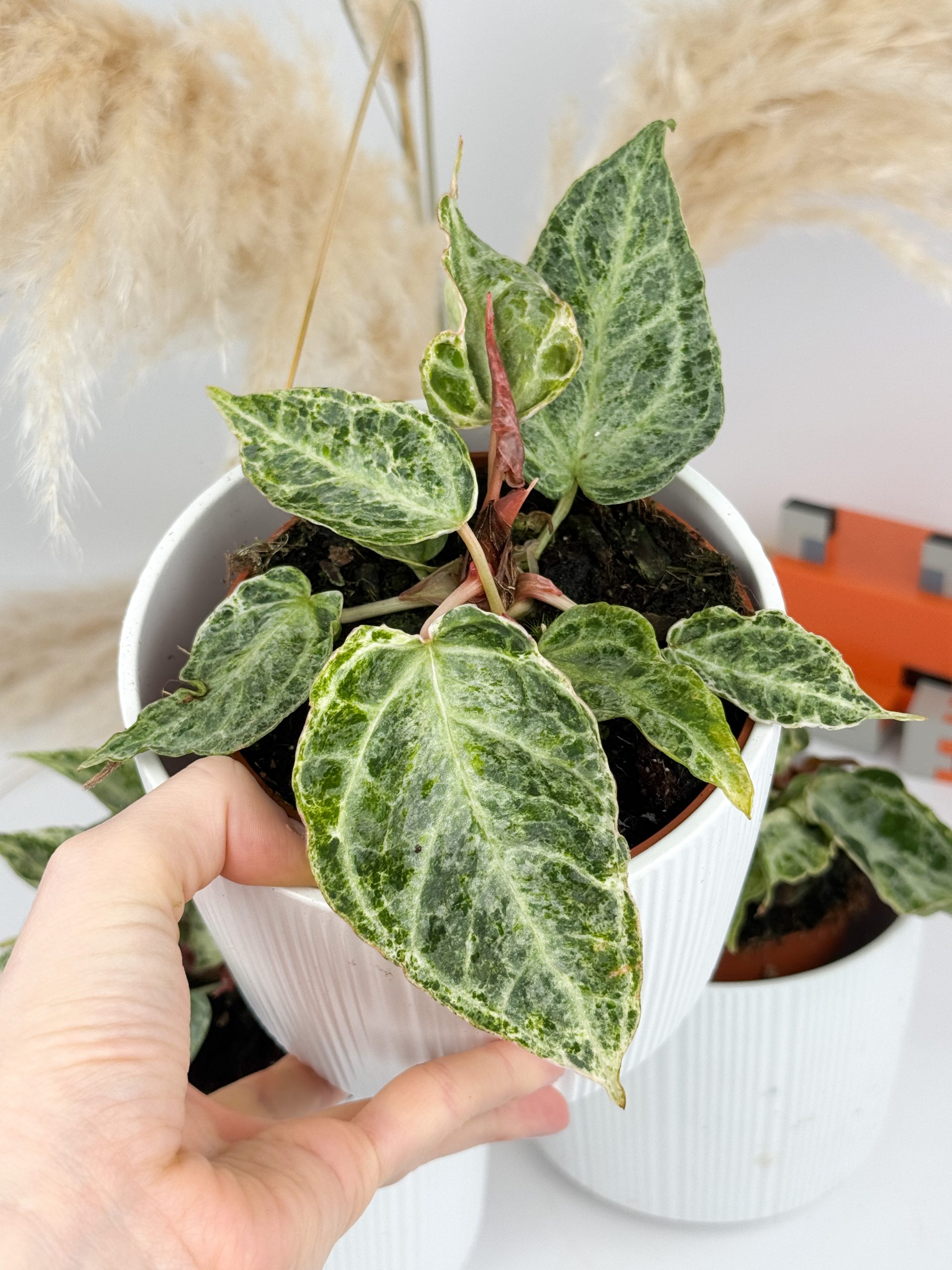 Die Anthurium ‘Silver Blush Variegata’ ist eine seltene Form der Silver Blush mit auffälliger, heller Panaschierung. Typisch sind die samtigen, herzförmigen Blätter mit silbriger Zeichnung, die bei dieser Form zusätzlich von hellen Partien durchzogen werden. Die Silver Blush selbst wird im Handel meist dem crystallinum-Typ zugeordnet.