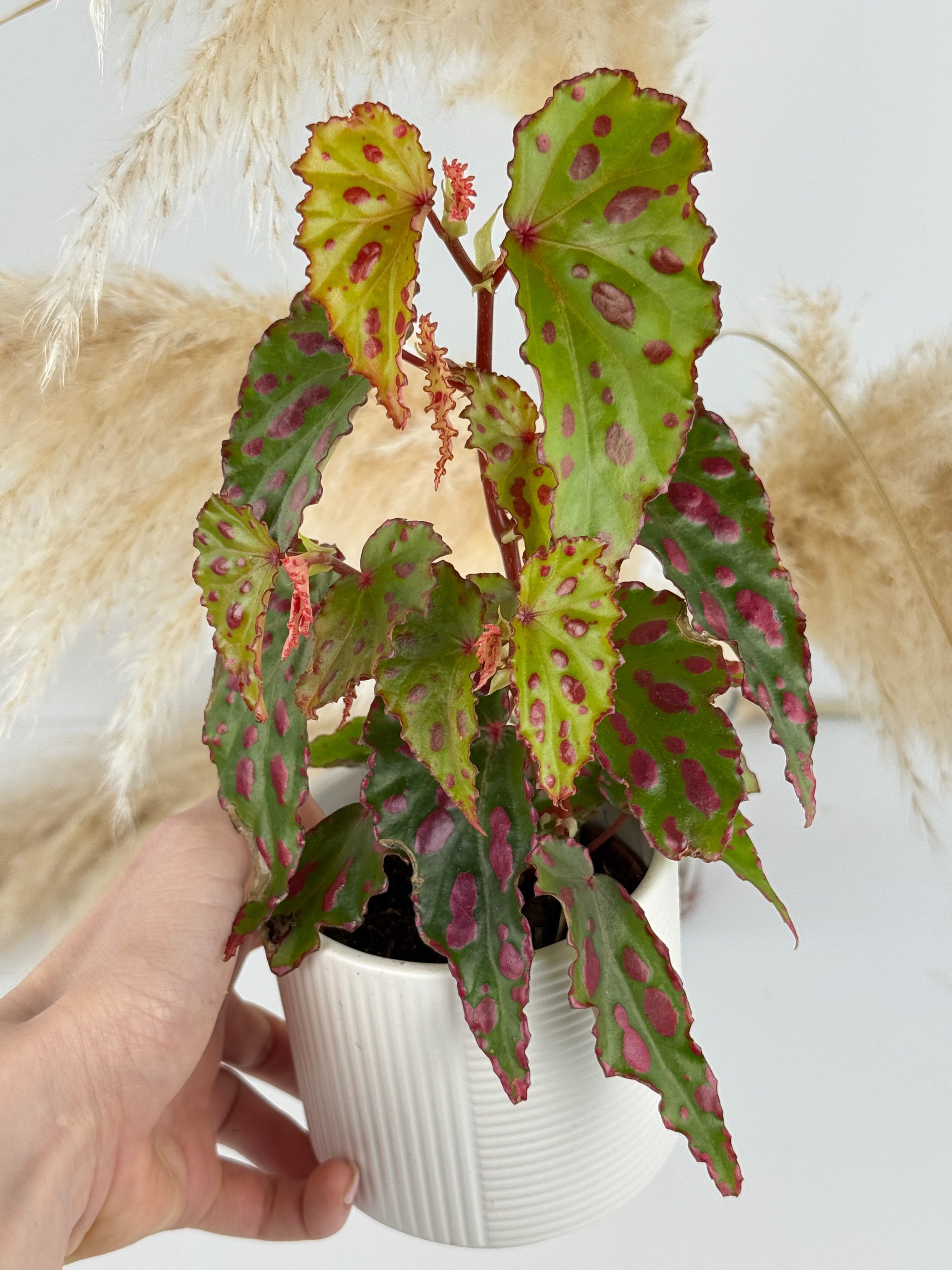 Die Begonia ‘Pink Dottie’ ist eine auffällige Blattbegonie mit rosa Punkten, die je nach Licht besonders intensiv wirken. Durch die kontrastreiche Zeichnung und den eher kompakten Wuchs ist sie eine schöne Wahl für alle, die besondere Blattmuster mögen.