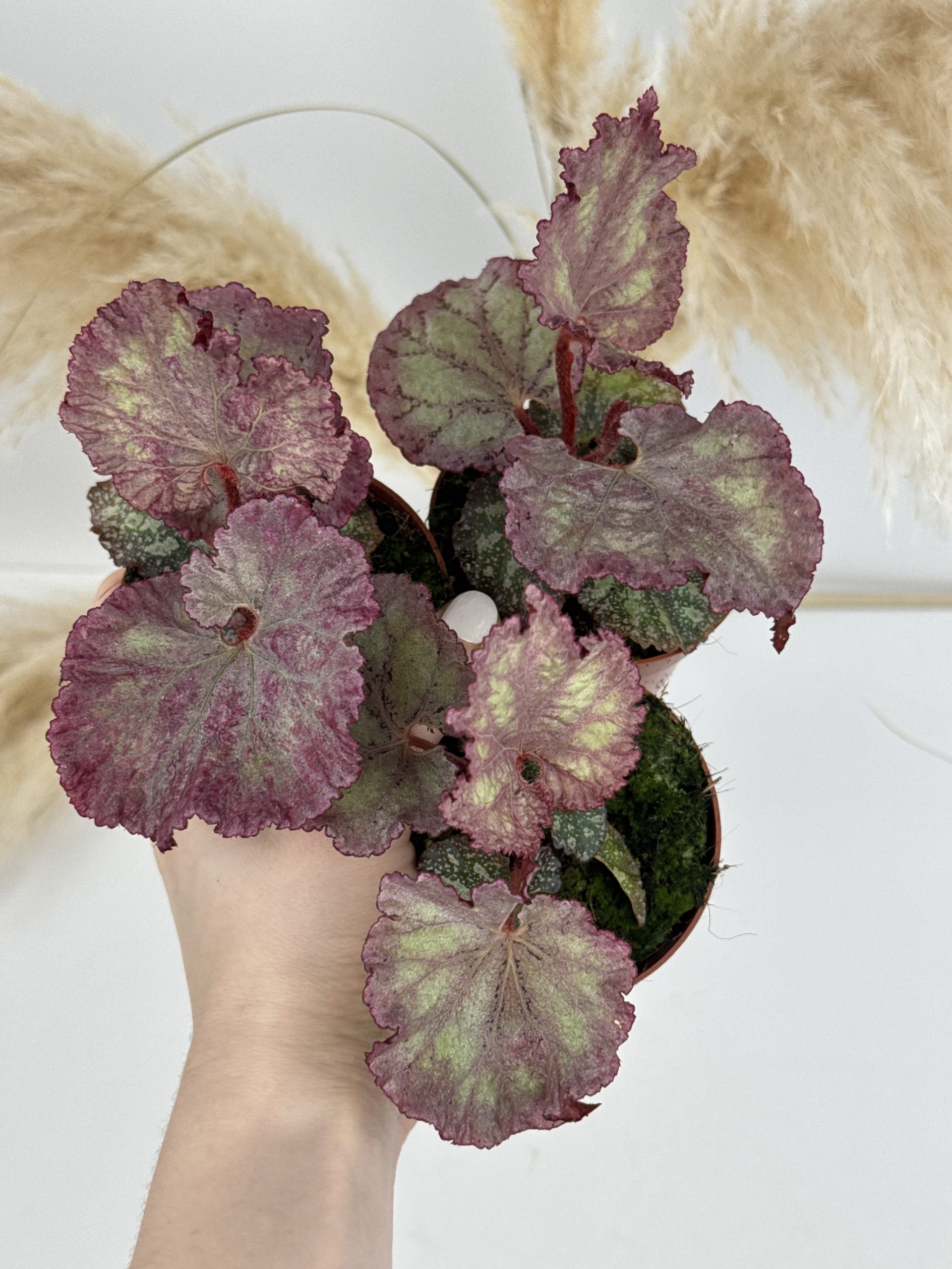 Die Begonia ‘Pink Panther’ ist eine auffällige Rex-Begonie mit kräftigen Pinktönen und kontrastreicher Blattzeichnung. Typisch sind Blätter in Pink, Dunkelgrün und Silber, die fast gemalt wirken und der Pflanze eine sehr besondere Ausstrahlung geben. Durch ihren kompakten Wuchs passt sie gut auf helle Fensterbänke, Regale oder in kleinere Pflanzenecken.