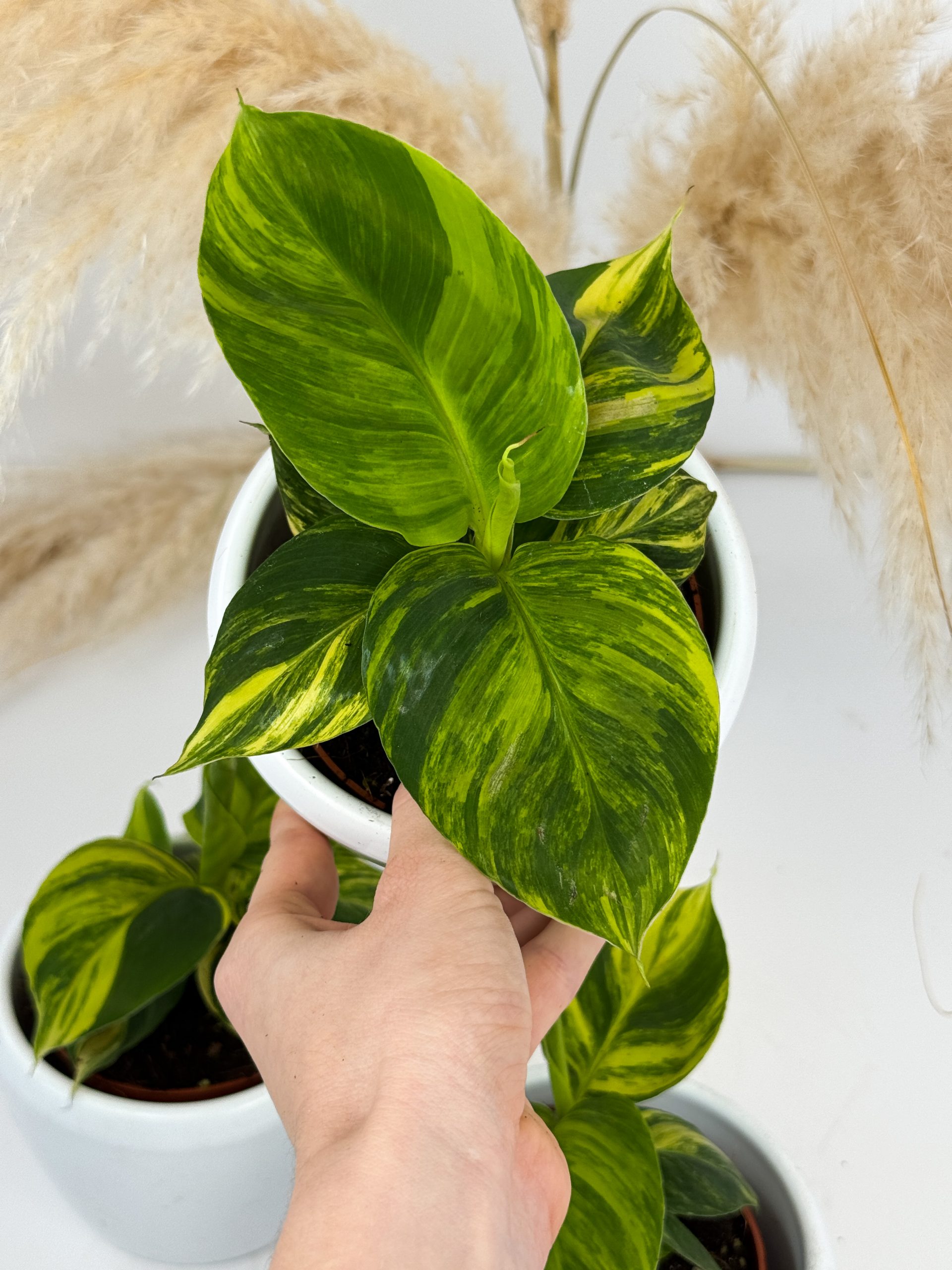 Die Musa ‘Aurea Variegata’ ist eine besondere Form der Banane und fällt vor allem durch ihre grün-gelb bis goldfarben panaschierten Blätter auf. Mit ihrem kräftigen, aufrechten Wuchs bringt sie schnell tropische Wirkung in den Raum und wirkt dabei etwas weicher und heller als andere panaschierte Musa-Formen.