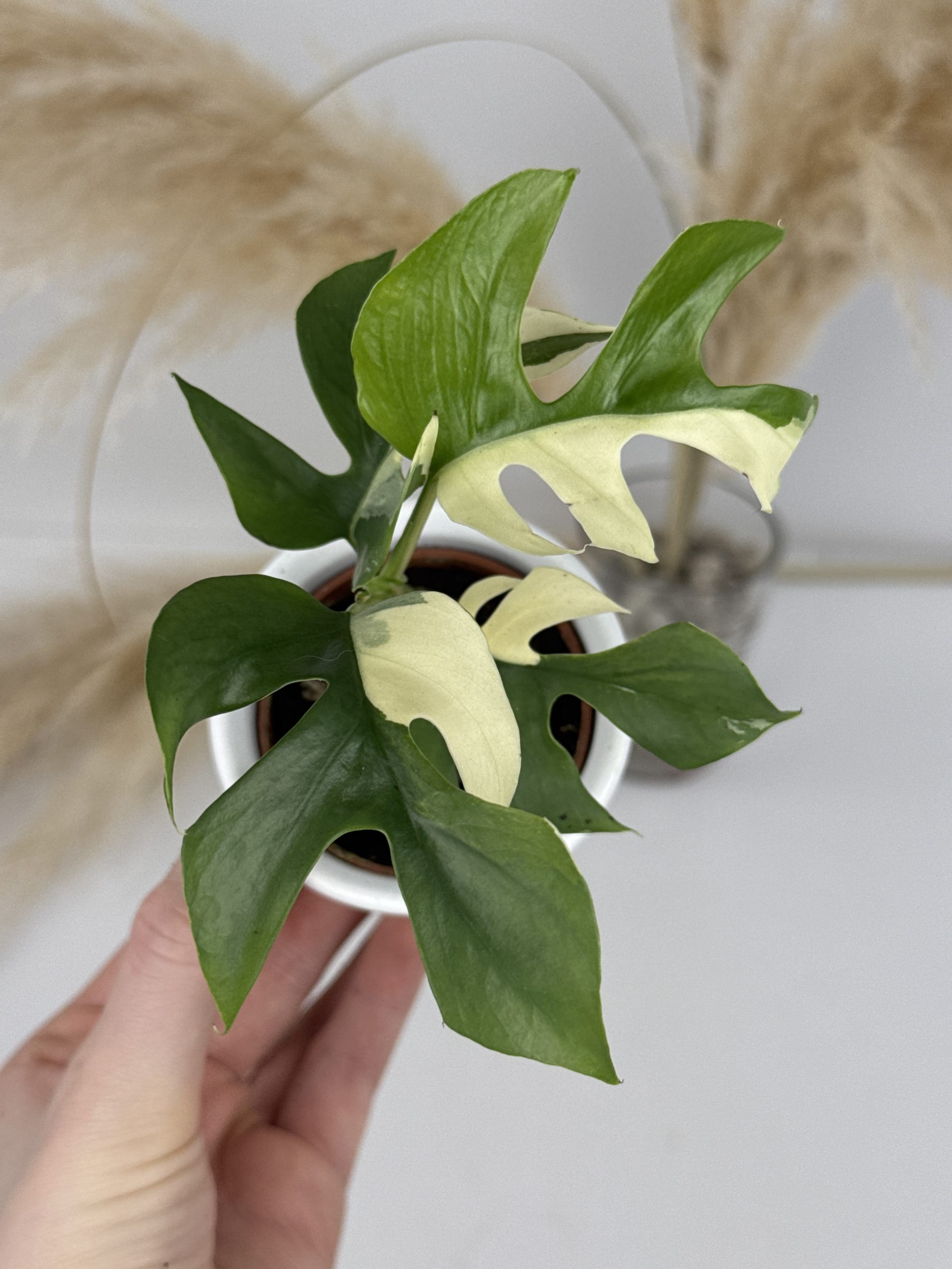 Die Rhaphidophora tetrasperma ‘Variegata’ ist die panaschierte Form der im Handel bekannten Mini-Monstera. Botanisch gehört sie nicht zur Monstera, sondern zur Gattung Rhaphidophora. In ihrer Heimat wächst sie kletternd im feucht-tropischen Klima. Charakteristisch sind die geschlitzten Blätter mit weißen bis cremefarbenen Partien, die je nach Blatt unterschiedlich stark ausfallen können.